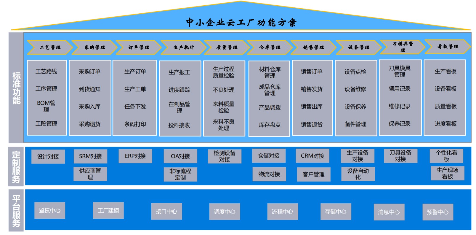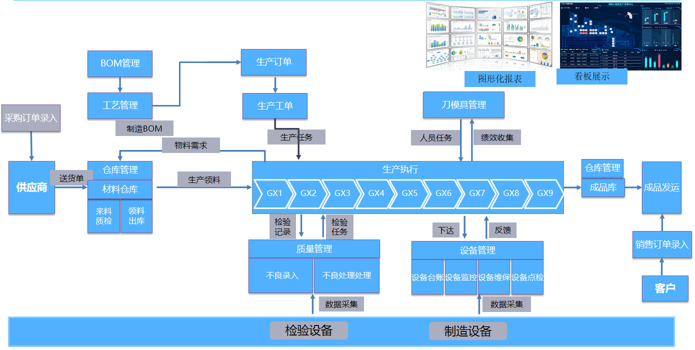 平臺包括主數(shù)據(jù)管理、銷售管理、采購管理、計(jì)劃管理、生產(chǎn)管理、質(zhì)量管理、倉儲管理、設(shè)備管理、模具及工裝管理、大數(shù)據(jù)看板等功能模塊。各功能模塊統(tǒng)一集成,構(gòu)建從設(shè)計(jì)到工藝、生產(chǎn)、質(zhì)量、設(shè)備和信息化全面集成的閉環(huán)業(yè)務(wù)體系。